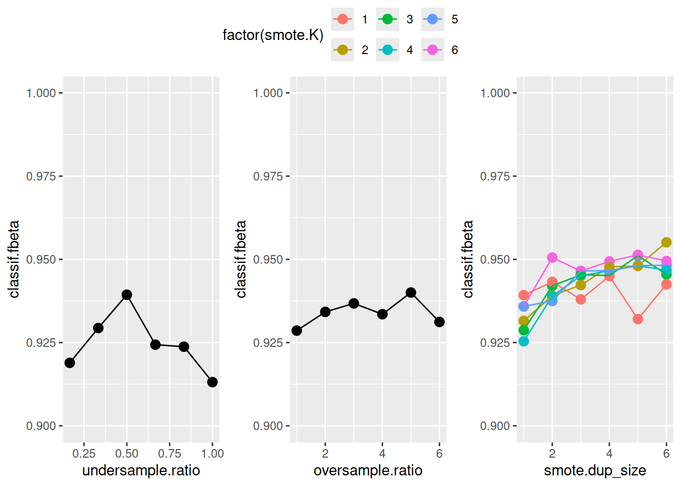 y = classif.fbeta, col = factor(smote.K))) +