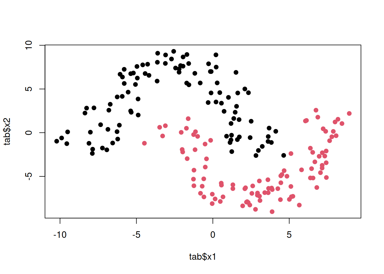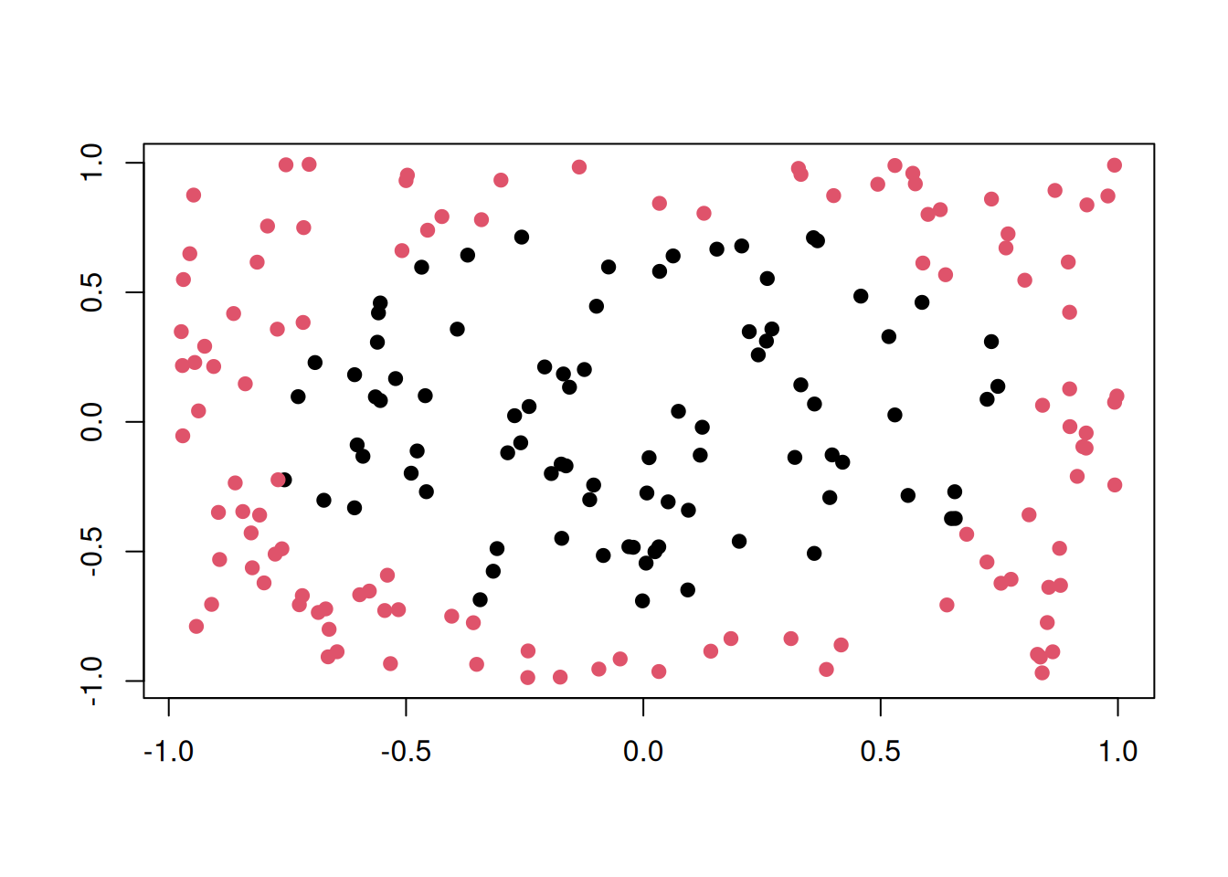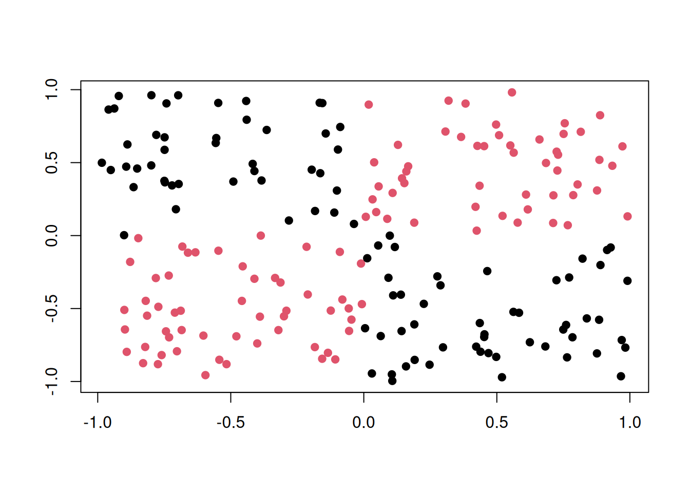 Points are distributed on a 2-dimensional cube with corners \((\pm 1, \pm 1)\). Class is "red" if \(x\) and \(y\) have the same sign, and "black" otherwise.