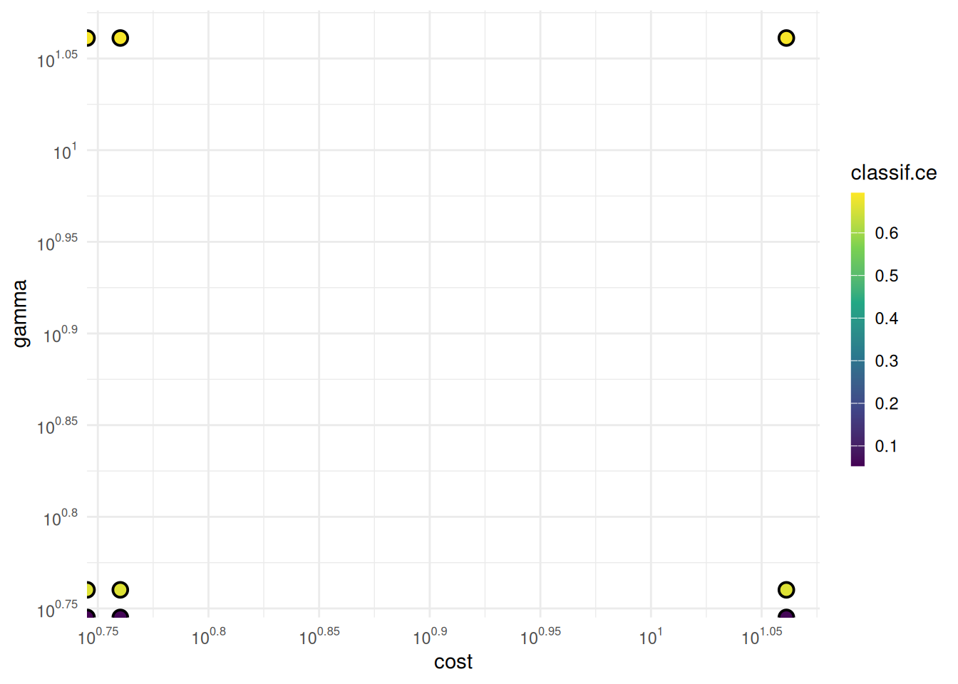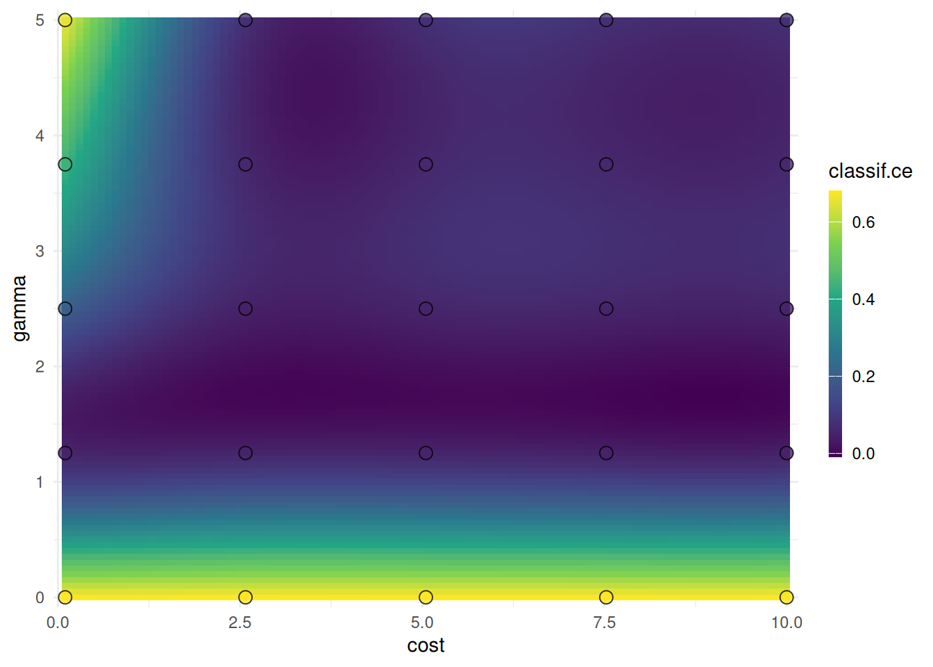 The points mark the evaluated cost and gamma values. We should not infer the performance of new values from the heatmap since it is only an interpolation. However, we can see the general interaction between the hyperparameters.