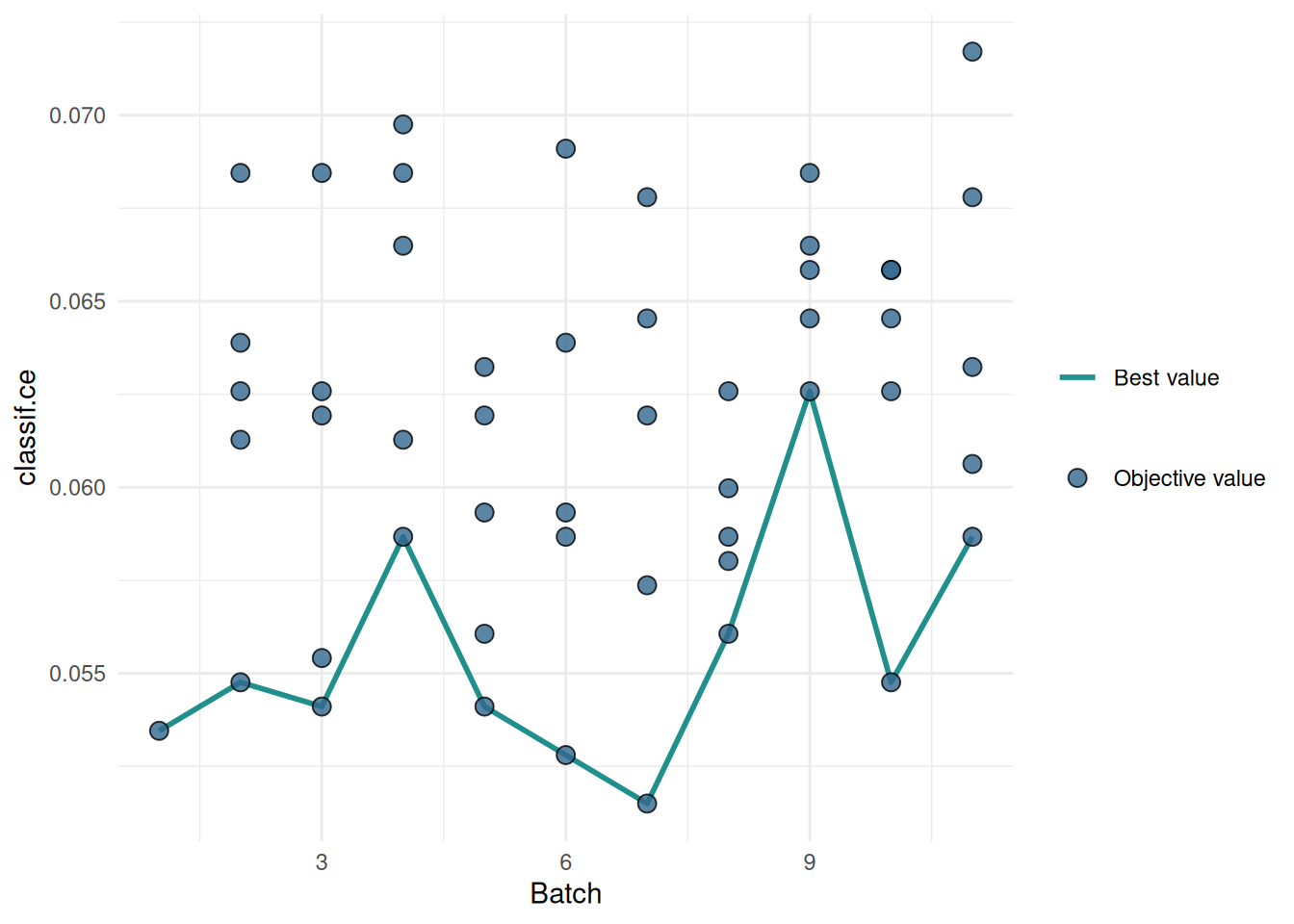 as.data.table(instance$archive)[, .(batch_nr, mtry.ratio, replace, sample.fraction, num.trees, classif.ce)] batch_nr mtry.ratio replace sample.fraction num.trees classif.ce