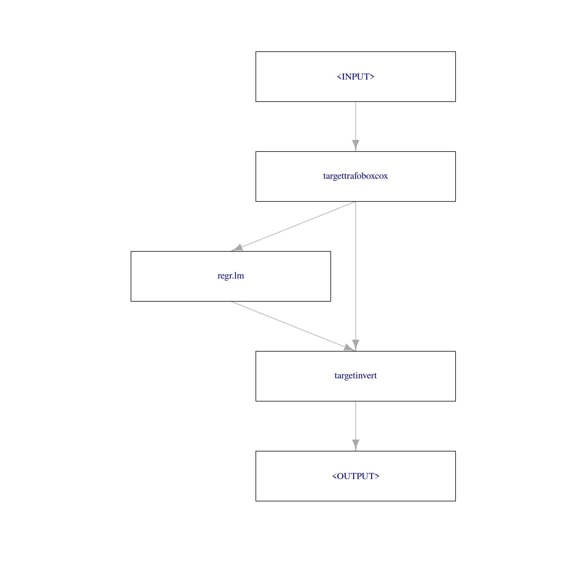 No matter how “complicated” the actual target transformation and inverse transformation may be, applying the inverse transformation function after having predicted from a Learner will always be done via PipeOpTargetInvert (as already outlined above, PipeOpTargetInvert has an empty ParamSet and its sole purpose is to apply the inverse transformation function after having predicted from a Learner). All Graphs for doing target transformations will therefore look similar like the simple one above, i.e., a target transformation PipeOp followed by some Learner or a whole Graph, followed by PipeOpTargetInvert. Therefore, using ppl("targettrafo") to construct such Graphs is highly recommended.
