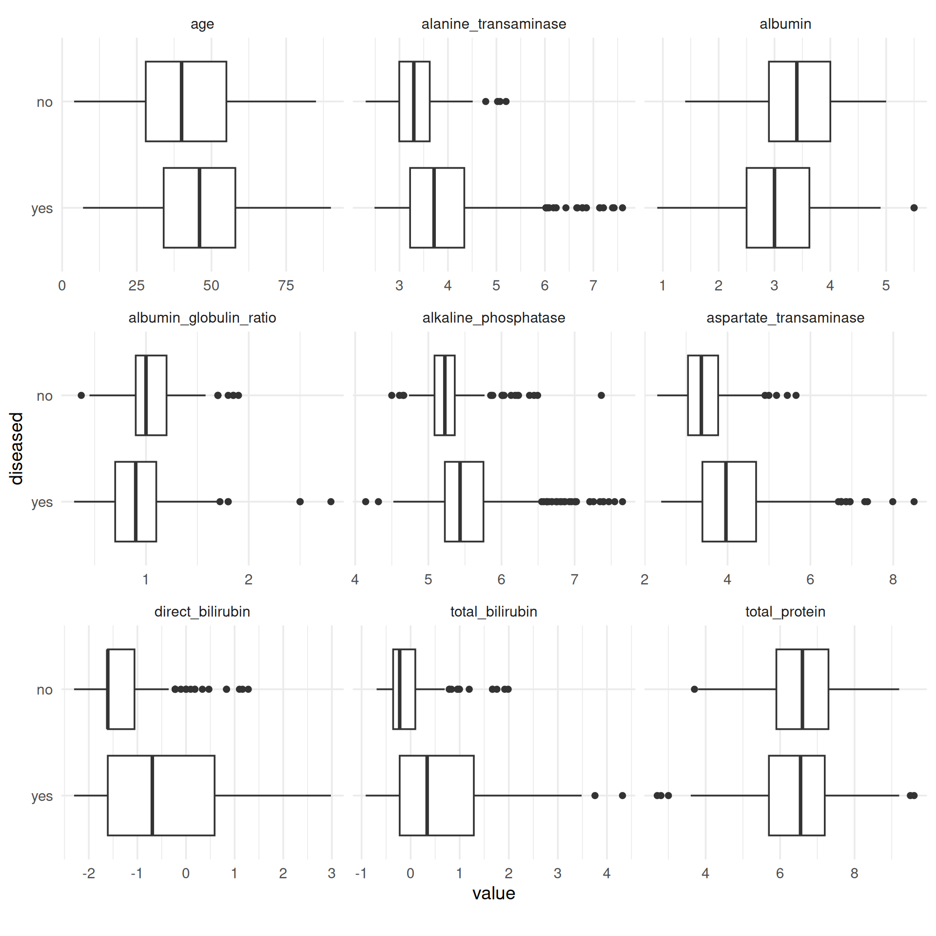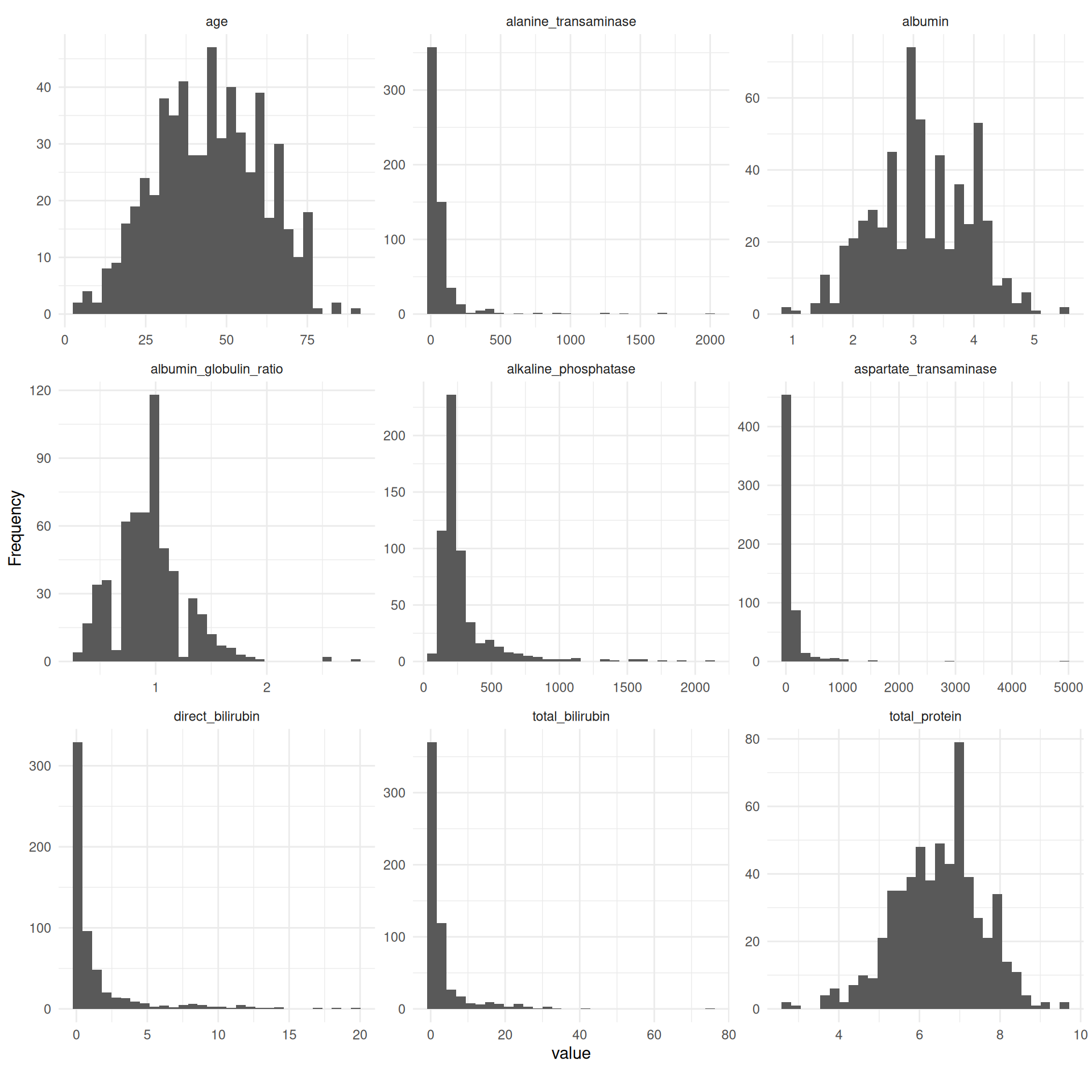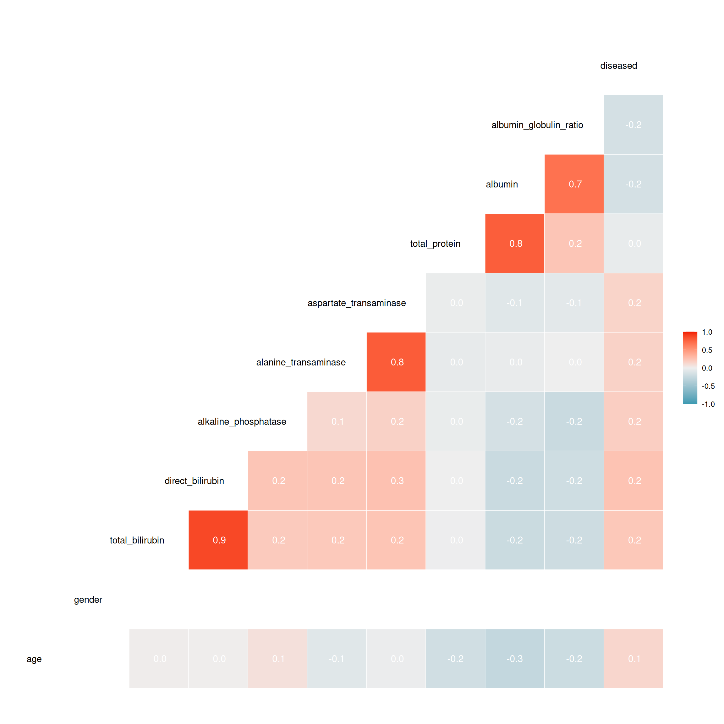 As one can see, besides age and gender, the dataset contains eight additional numerical features. While the names and corresponding measurements look rather cryptic to the uninformed eye, they are all part of standard blood tests conducted to gather information about the state of a patient’s liver, so-called liver function tests. All of these measurements are frequently used markers for liver disease. For the first five, measuring the chemical compound bilirubin and the three enzymes alkaline phosphatase, alanine transaminase and aspartate transaminase, elevated levels indicate liver disease Gowda et al. (2009) Oh and Hustead (2011). For the remaining three, which concern protein levels, lower-than-normal values suggest a liver problem Carvalho and Machado (2018) Total Protein, Albumin-Globulin (A/G) Ratio (n.d.). Lastly, one should note that some of the measurements are part of more than one variable. For example, the total serum bilirubin is simply the sum of both the direct and indirect bilirubin levels and the amount of albumin is used to calculate the values of the total serum protein as well as the albumin-to-globulin ratio. So, one might already suspect that some of the features are highly correlated to one another, but more on that kind of analysis in the following section.