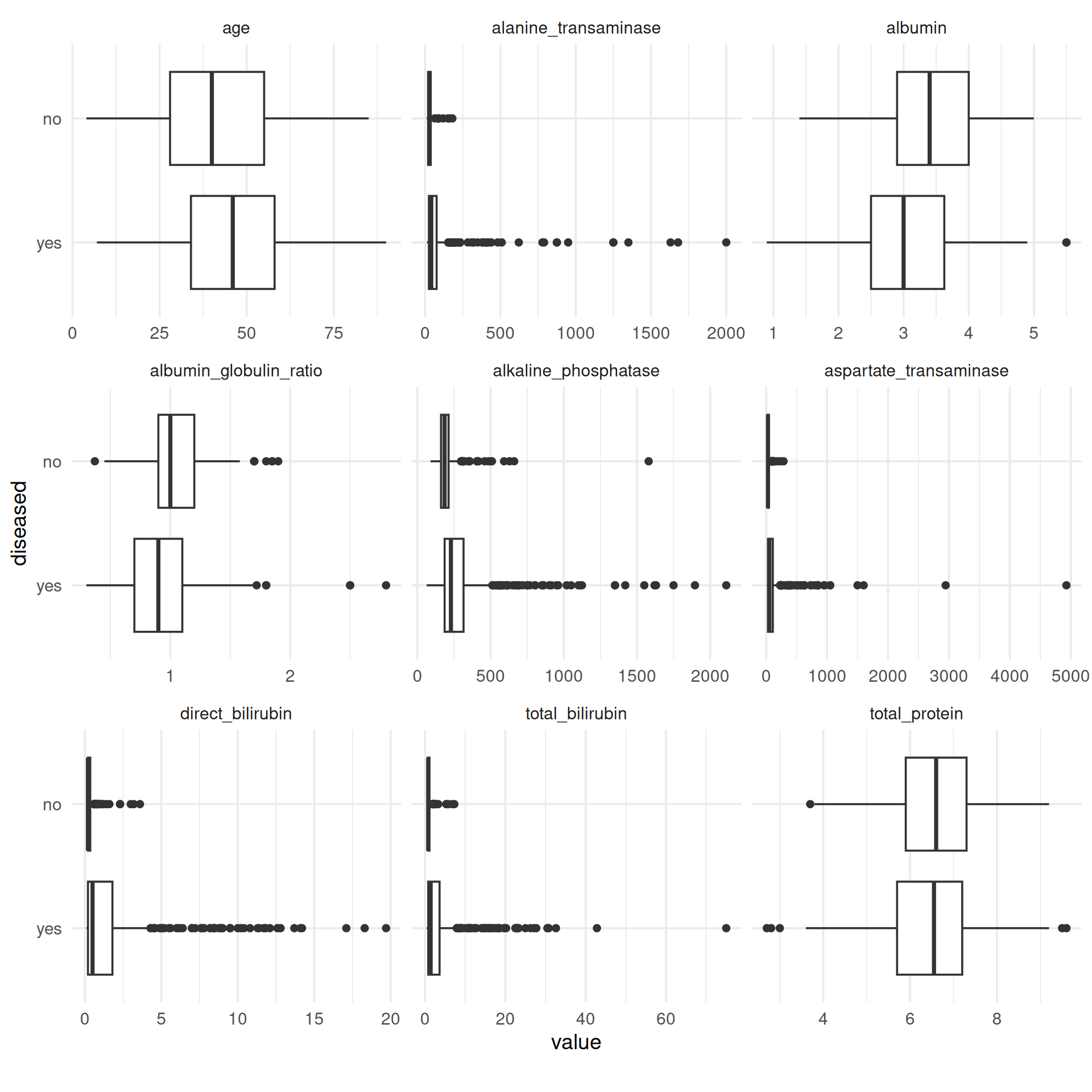 data("ilpd", package = "mlr3data")It contains data for 583 patients collected in the north east of Andhra Pradesh, one of the 28 states of India. The observations are divided into two classes based on the patient having liver disease or not. Besides the class variable, which is our target, ten, mostly numerical, features are provided. To describe the features in more detail, the table below lists the variables included in the dataset.