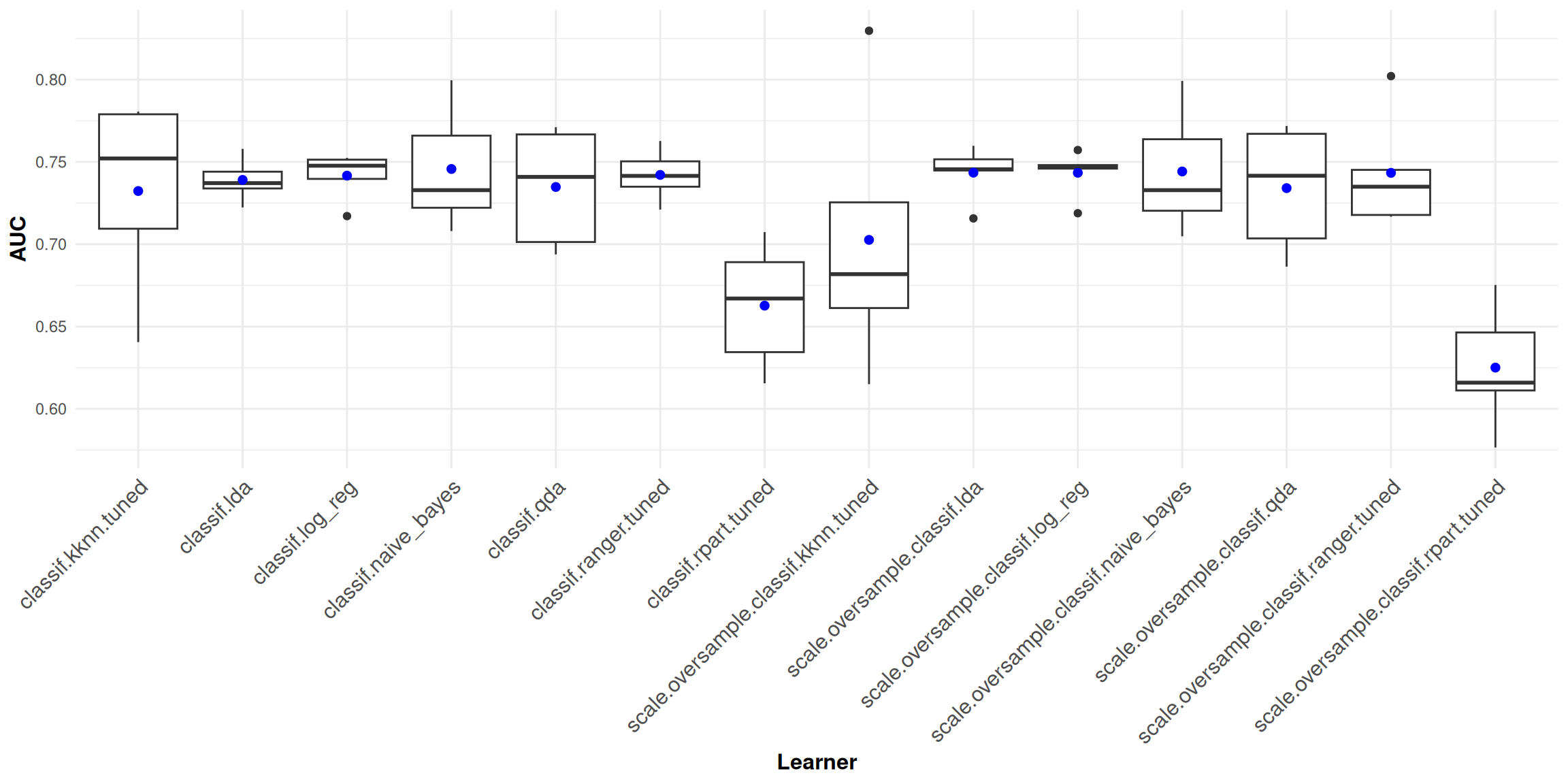 The boxplots below graphically summarize AUC performance of all learners, with the blue dots indicating mean AUC performance.