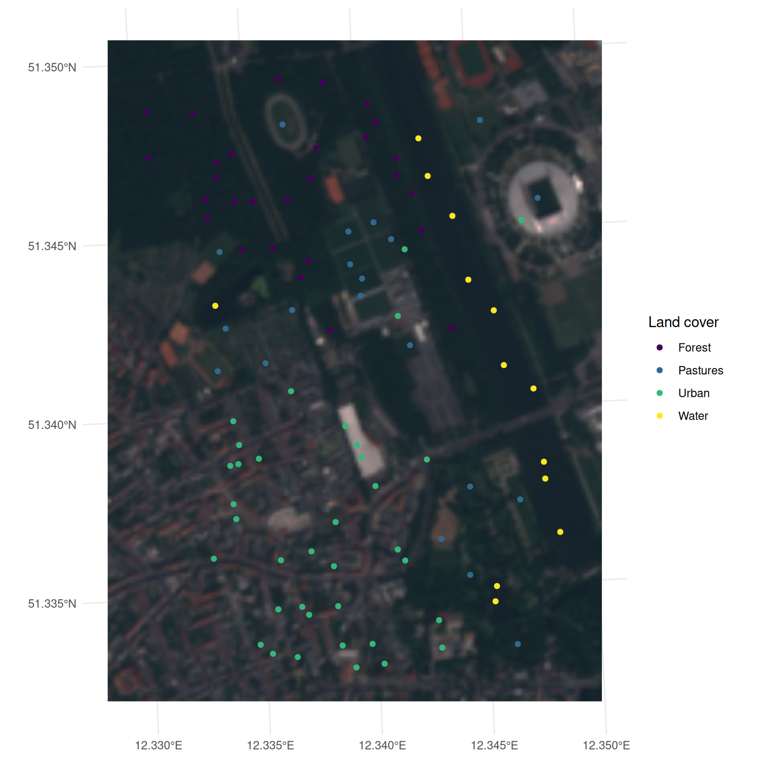 Land cover is the physical material or vegetation that covers the surface of the earth, including both natural and human-made features. Understanding land cover patterns and changes over time is critical for addressing global environmental challenges, such as climate change, land degradation, and loss of biodiversity. Land cover classification is the process of assigning land cover classes to pixels in a raster image. With mlr3spatial, we can easily perform a land cover classification within the mlr3 ecosystem.