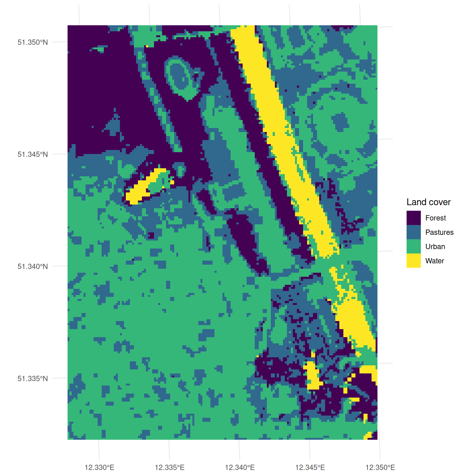 scale_fill_viridis_d(name = "Land cover", labels = c("Forest", "Pastures", "Urban", "Water")) +